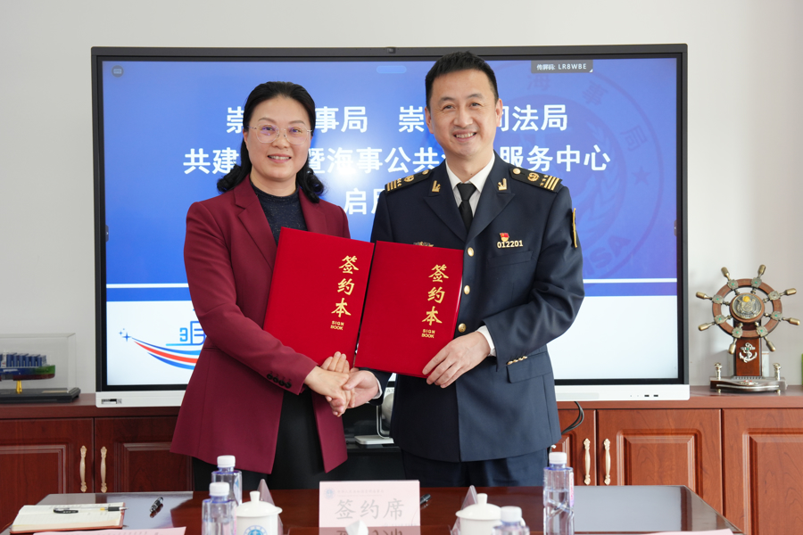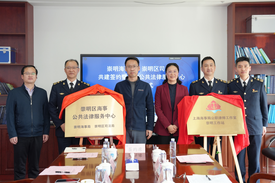 3月27日,崇明海事局与崇明区司法局在崇明区长兴镇横沙渔港大楼举行共建签约暨海事寰球法律干事中心启用庆典。