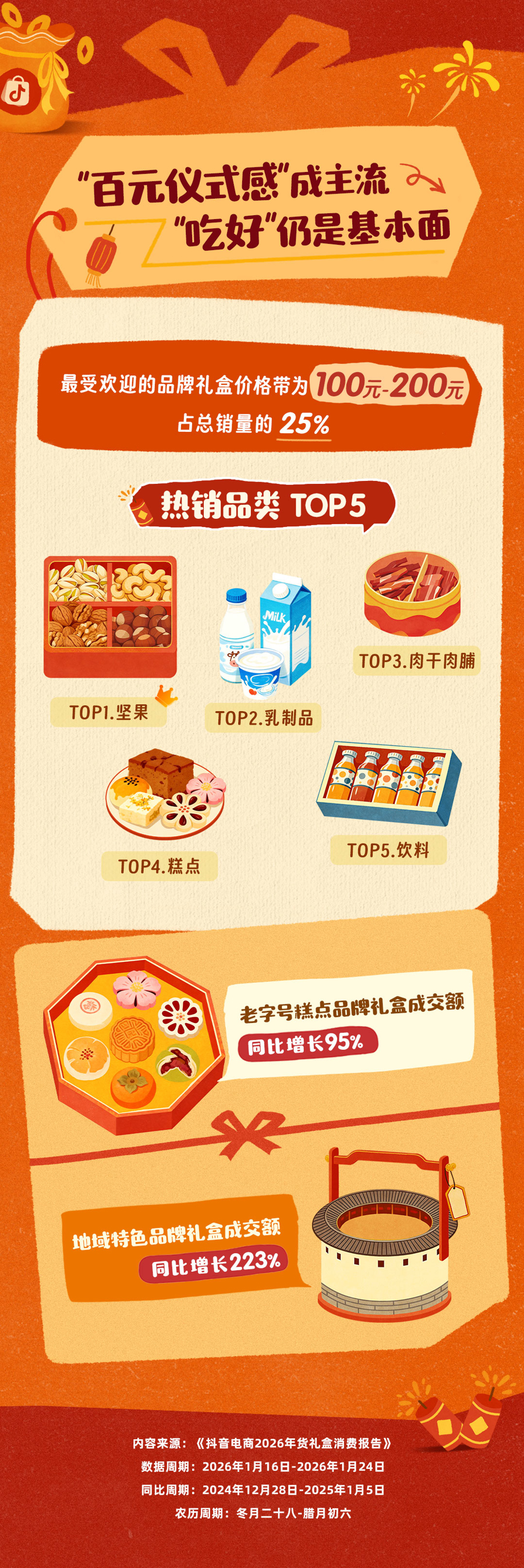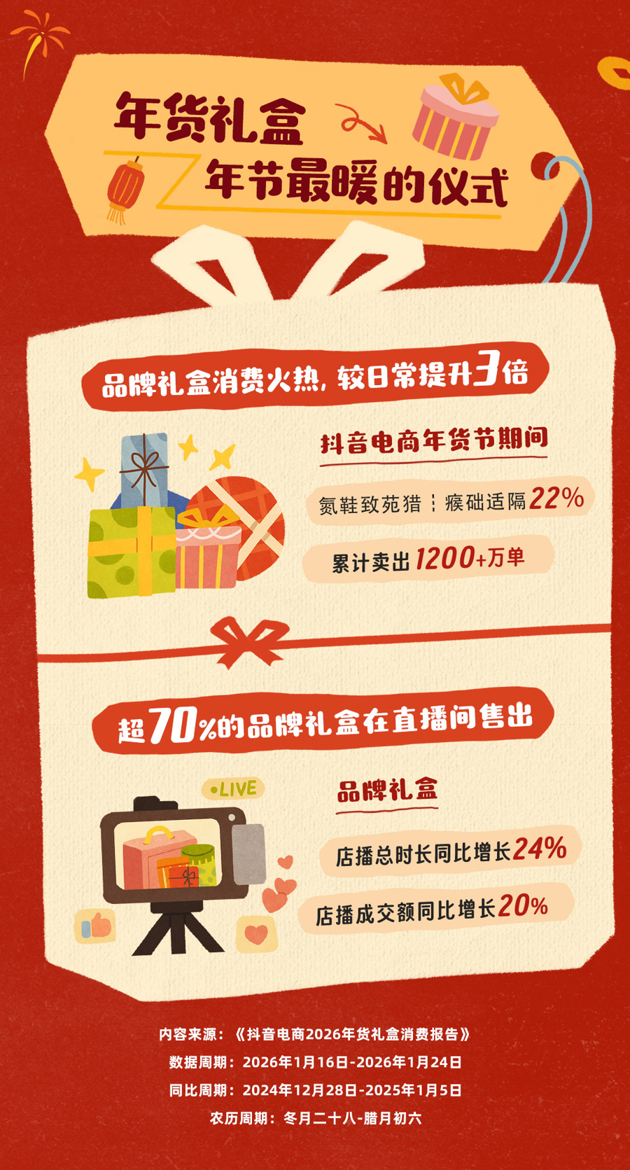 1月16日,“2026年抖音商城年货节”正式开启,覆盖新年新品服饰、特色地方美食、马年文创礼赠等全品类年货好物,其中包括走亲访友、团圆餐桌、旅途食饮品牌年货礼盒。报告显示,在年货节氛围助推下,2026年1月16日至24日,抖音电商品牌礼盒销量较日常提升3倍,成交额同比增长22%,累计卖出超1200万单。