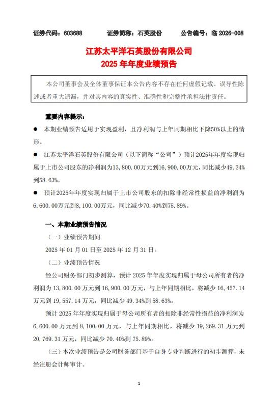 石英股份(603688)发布2025年年度业绩预告。公司预计2025年年度实现归属于上市公司股东的净利润为13,800.00万元到16,900.00万元,同比减少49.34%到58.63%。预计2025年年度实现归属于上市公司股东的扣除非经常性损益的净利润为6,600.00万元到8,100.00万元,同比减少70.40%到75.89%。