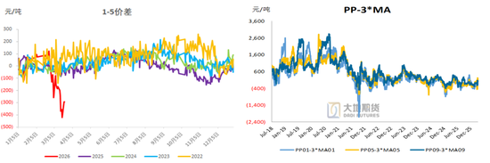 因为26年PP仍处于产能投放周期,尤其是下半年投产荟萃,揣度PP-3*MA价差难以保管高位,不错温雅逢高作念缩PP和MA价差的契机。