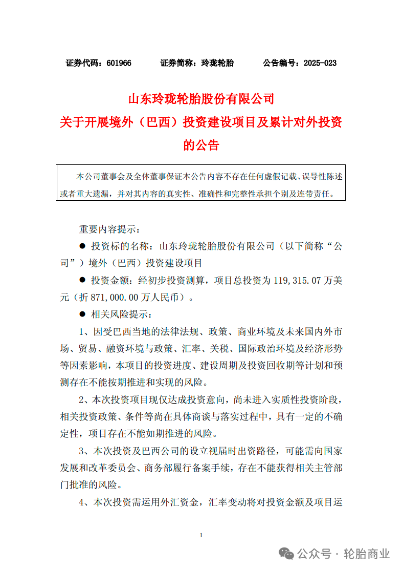 2025年4月25日,玲珑轮胎发布对于开展境外(巴西)投资诱骗名堂及累计对外投资的公告。山东玲珑轮胎股份有限公司巴西)投资诱骗名堂,名堂总投资为119,315.07万好意思元(折 871,000.00 万东谈主民币)。