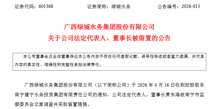 4月17日,绿城水务公告称,收到控股推动告知,公法令定代表东谈主、董事长黄东海被南宁市监察委员会立案造访并领受留置门径。凭证限定,经半数董事推举,由董事周柏建代为履职。