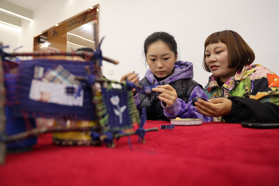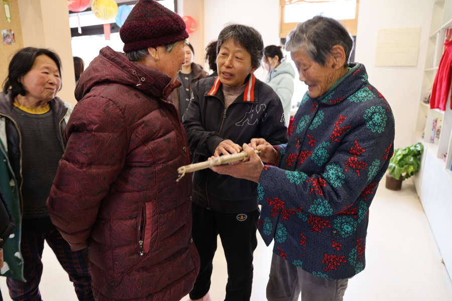 奶奶们拿着早年织布用的老物件回忆着年青时的故事