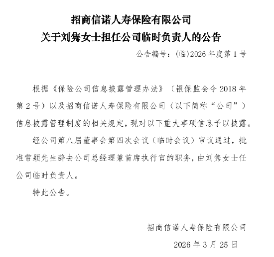 3月25日金融一线音书,招商信诺本日发布公告称,经公司第八届董事会第四次会议(临时会议)审议通过,批准总司理兼首席执行官常颖辞去公司职务,由刘隽任公司临时厚爱东谈主。
