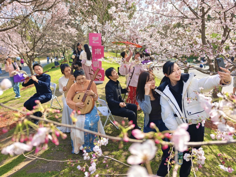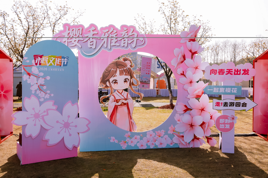 顾村公园内,艺术街角献技、樱花衣饰秀、非遗江南丝竹流动扮演、“樱花树下的故事荟”亲子阅读行径,以及“花间织梦”非遗插画展、“二十四骨气诗字画乐巡展”等,让游园体验与艺术享受口舌分明。