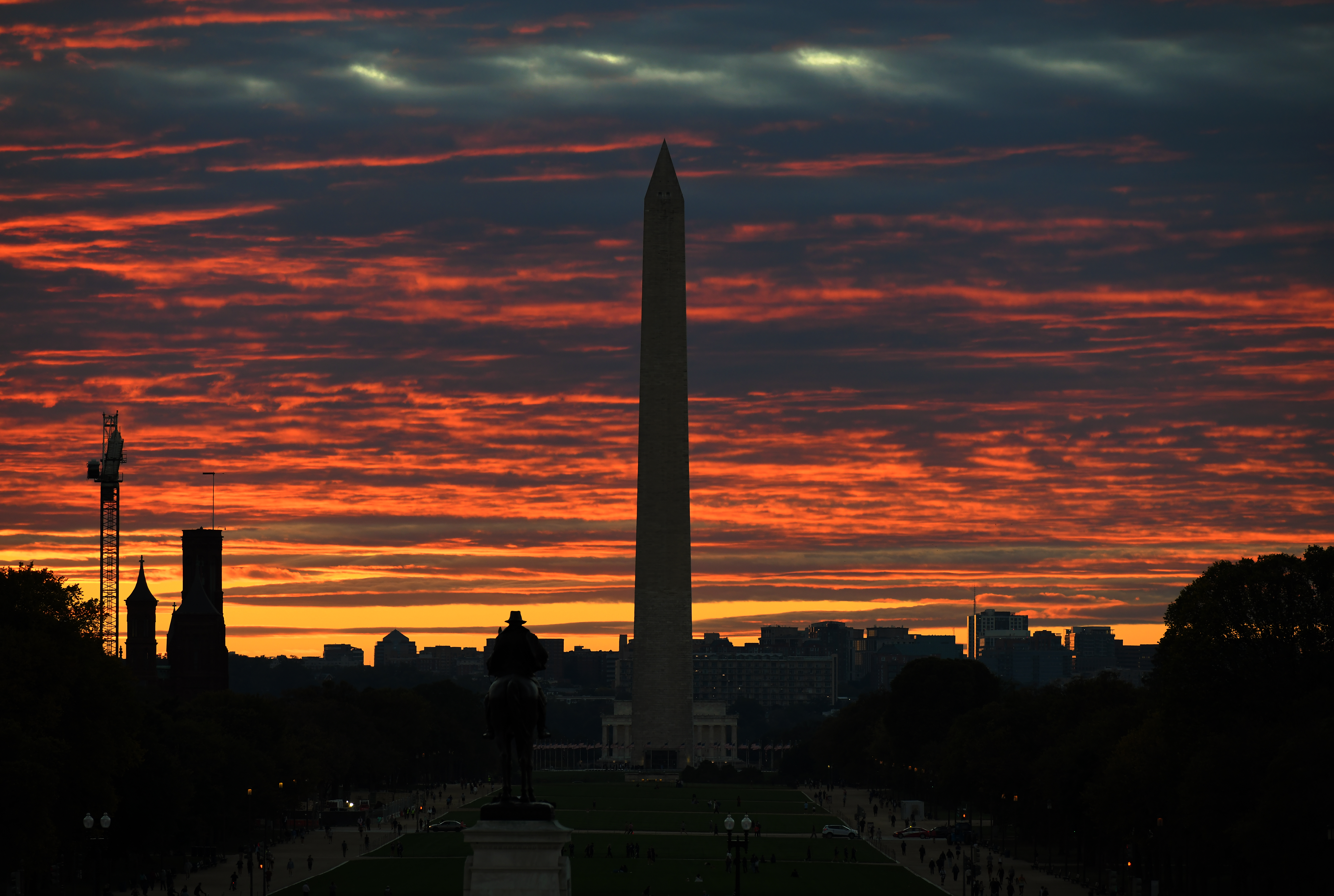这是2025年10月15日拍摄的日落时分的美国华盛顿纪念碑。新华社记者李睿摄